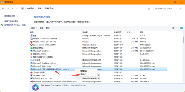 1、打开控制面板,选择【程序】中的【卸载程序】。找到office对应的程序,按下鼠标右键,选择【更改】选项。