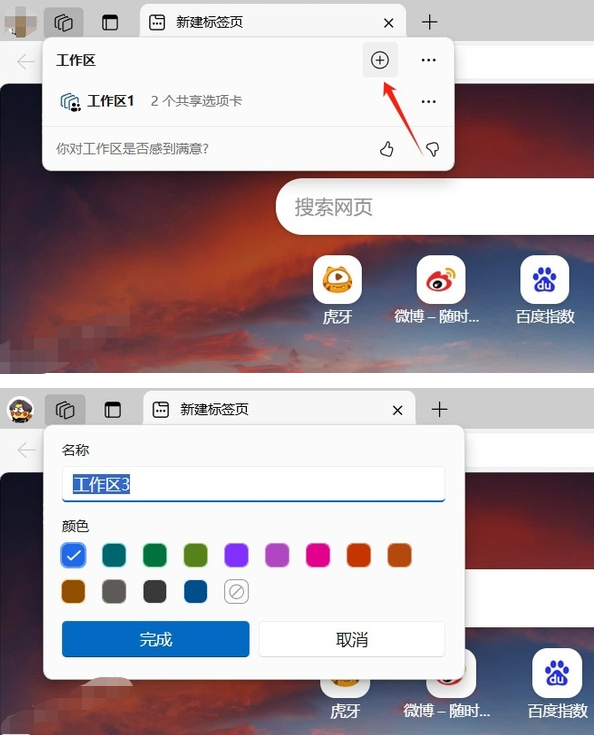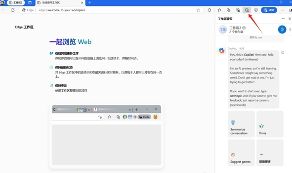 1.首先,打开最新版的Edge浏览器,然后点击页面左上角头像旁边的工作区按钮。?