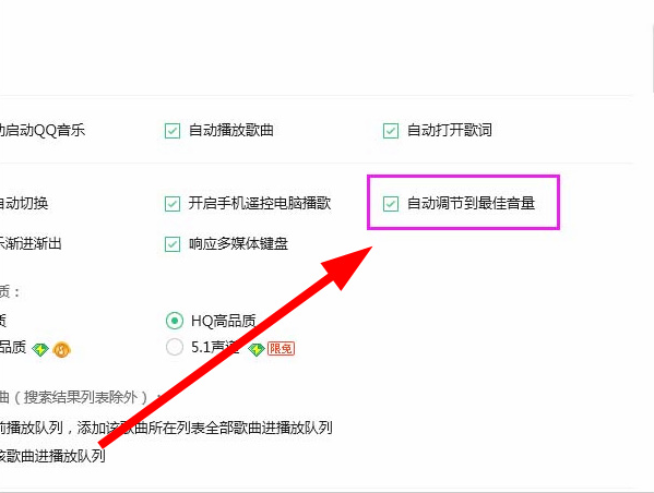 3、随后,在弹出的设置窗口中,我们下拉列表,找到【自动调节到最佳音量】,将其勾选即可。?