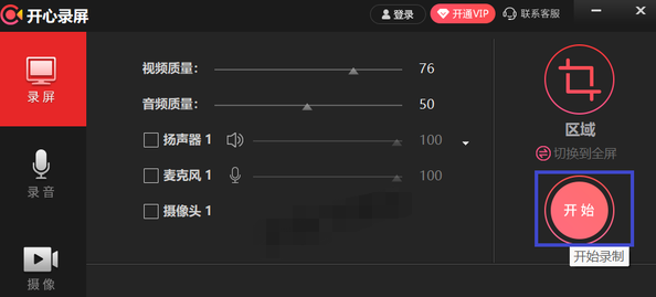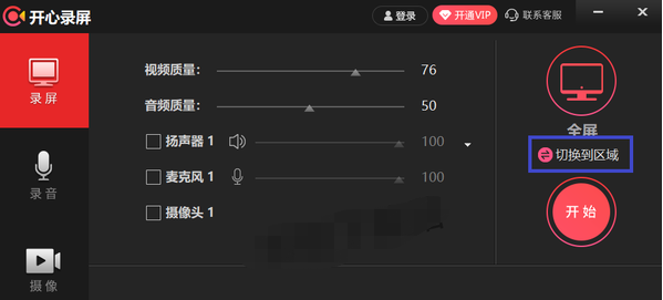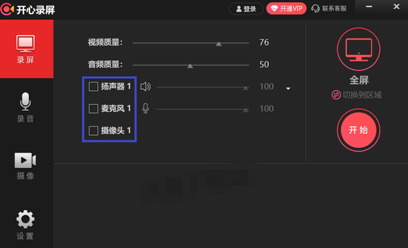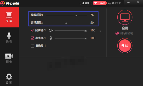 1.打开最新版本的开心录屏,首先在上方调整【视频质量】和【音频质量】,质量越高,视频文件越大。?