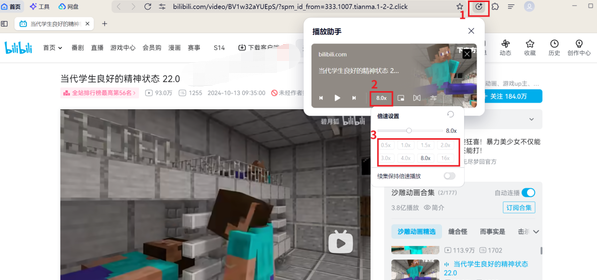 2.点击右上角【播放助手】-【倍速】,选择合适的视频播放速度。打开下方【续集保持倍速播放】选项,在此网页播放下一个视频依然会保持设置的视频倍速。?