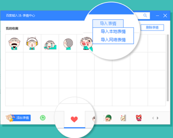 2、在“我的收藏”选项中点击“导入表情”,还可以将本地的表情或者网络上看到的新鲜表情导入到百度输入法的表情包库中。?