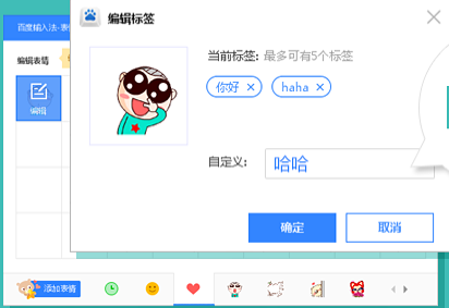 3、如果想让某一个表情可以随时出现在聊天时方便发送,我们可以给这个表情添加上想要的标签,也就是备注,这样再输入对应的标签文字的时候就可以快速找到这个表情了。当我们编辑完标签内容以后,也不要忘记点“确定”键进行保存哦。?