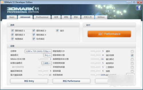 2、然后切换到“advanced”选择图形测试、物理测试和综合测试以及设置分辨率、缩放模式等。