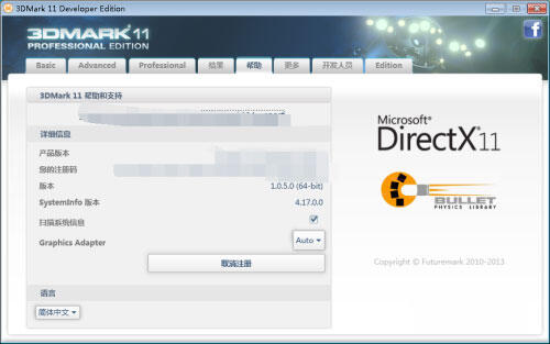 5、在帮助菜单中能够查看到3DMark软件的详细信息中查看产品版本、注册码和版本等先关信息。