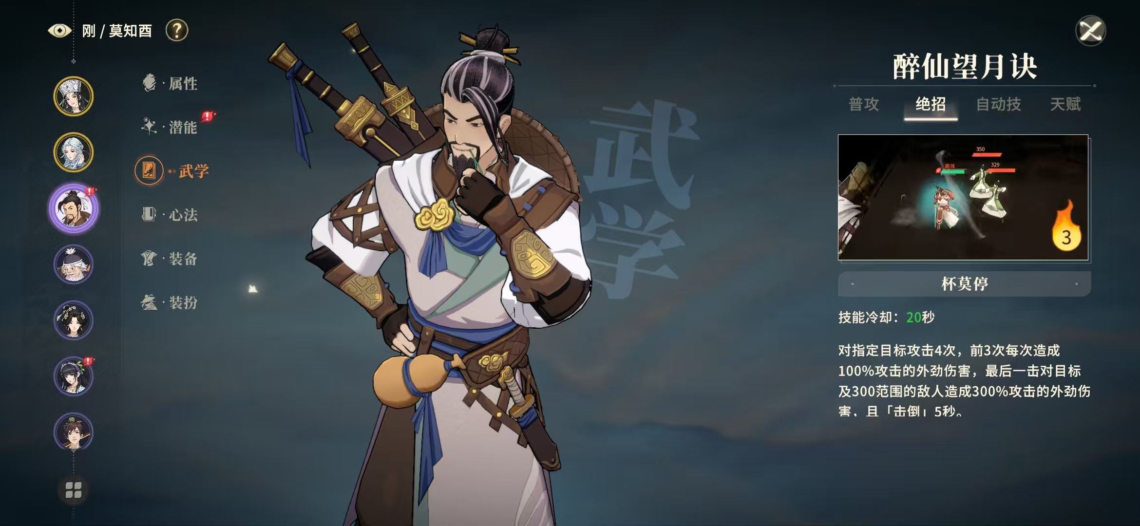 技能描述:对指定目标攻击4次,前3次每次造成100%外劲伤害,最后一击对目标及300范围的敌人造成300%外劲伤害,且「击倒」5秒。