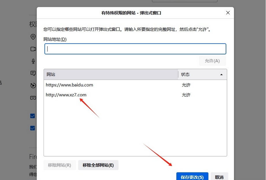 5.来到有特殊权限的网站窗口中,用户在网站地址方框中输入网址并按下允许按钮
