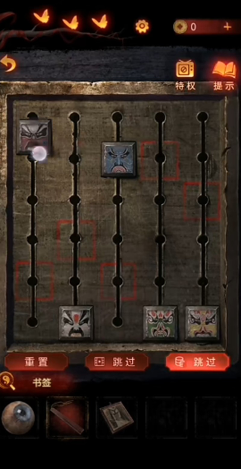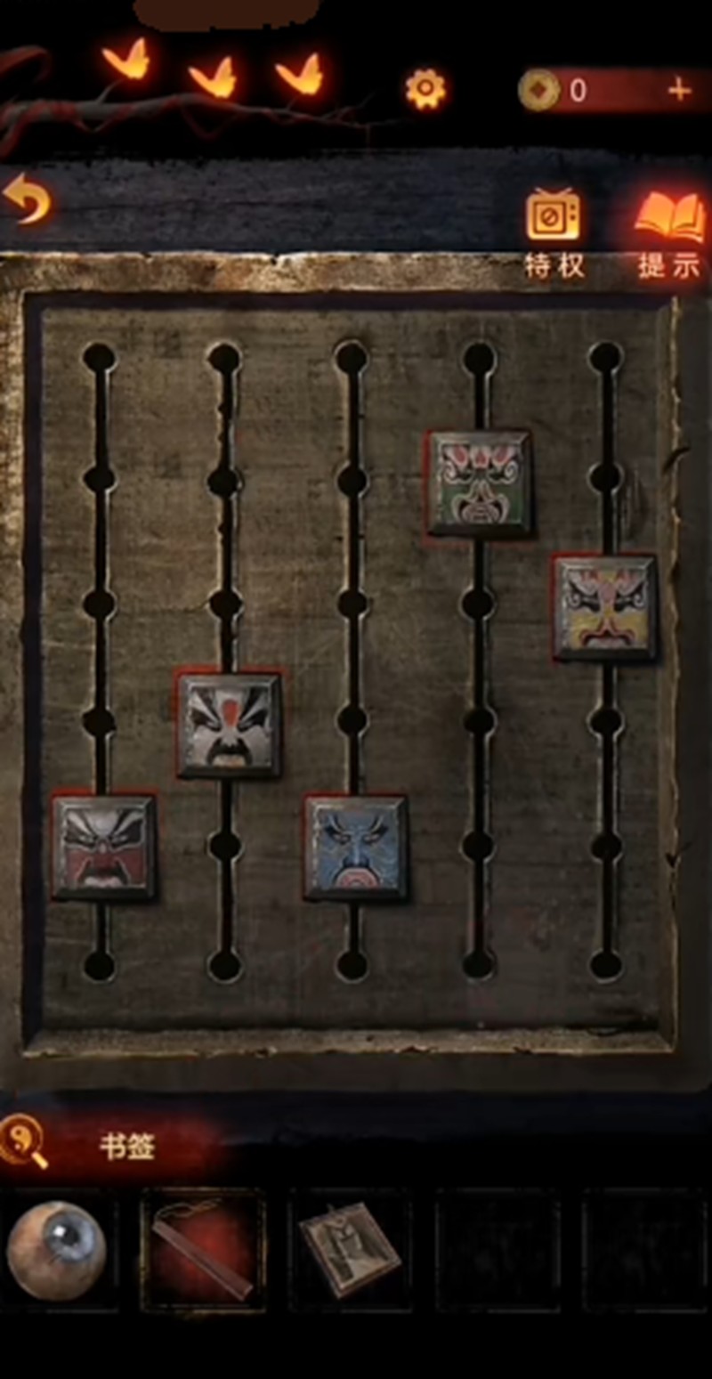 第三章的脸谱解谜更为复杂。玩家需要点击桌子上的木盒,会出现五个用红色方块标记的点。调整方块时,整体方块会下移。这里需要将五张不同的脸谱放到对应的方块上。