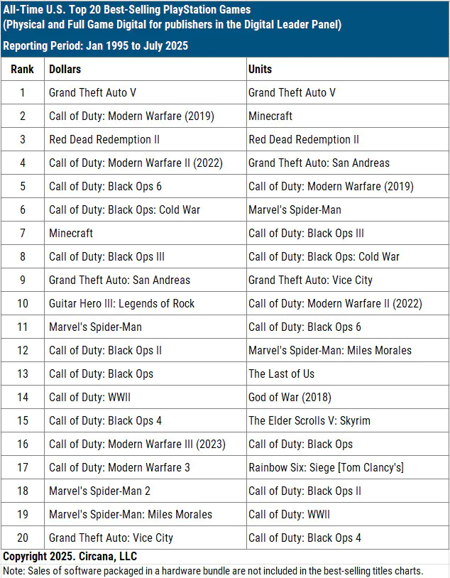 最新曝光的PlayStation历史畅销游戏榜单进一步凸显了该系列的统治地位——多款《使命召唤》游戏位居榜单前列。