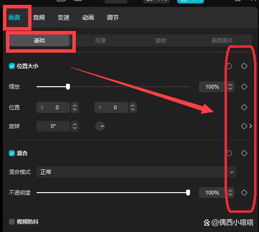 2、来到右侧,通常不需要手动选择,会默认在画面面板,第一个基础选项卡,每一项,比如果缩放、位置、旋转等地方,最后方有一个菱形图标,点击即可添加关键帧: