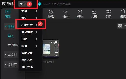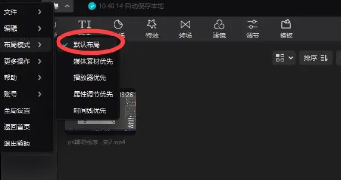 1、点击剪映左上角的菜单,下拉里可以看到布局模式,点击: