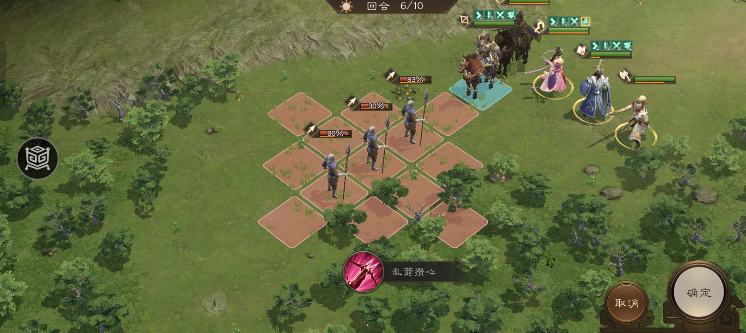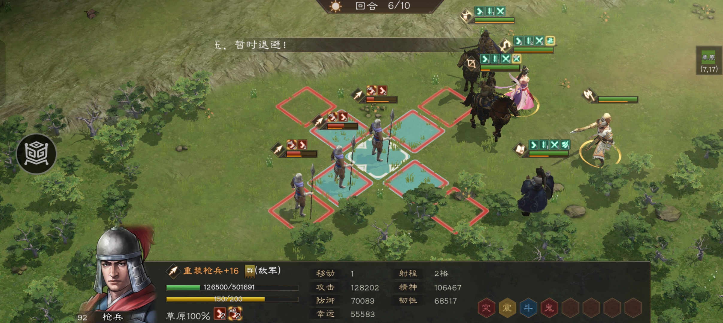 左侧枪兵移动慢。我们优先打右侧骑兵