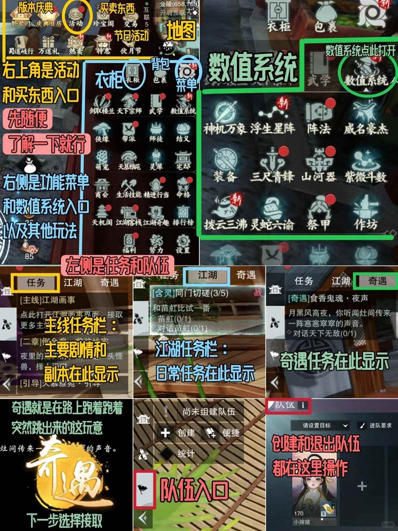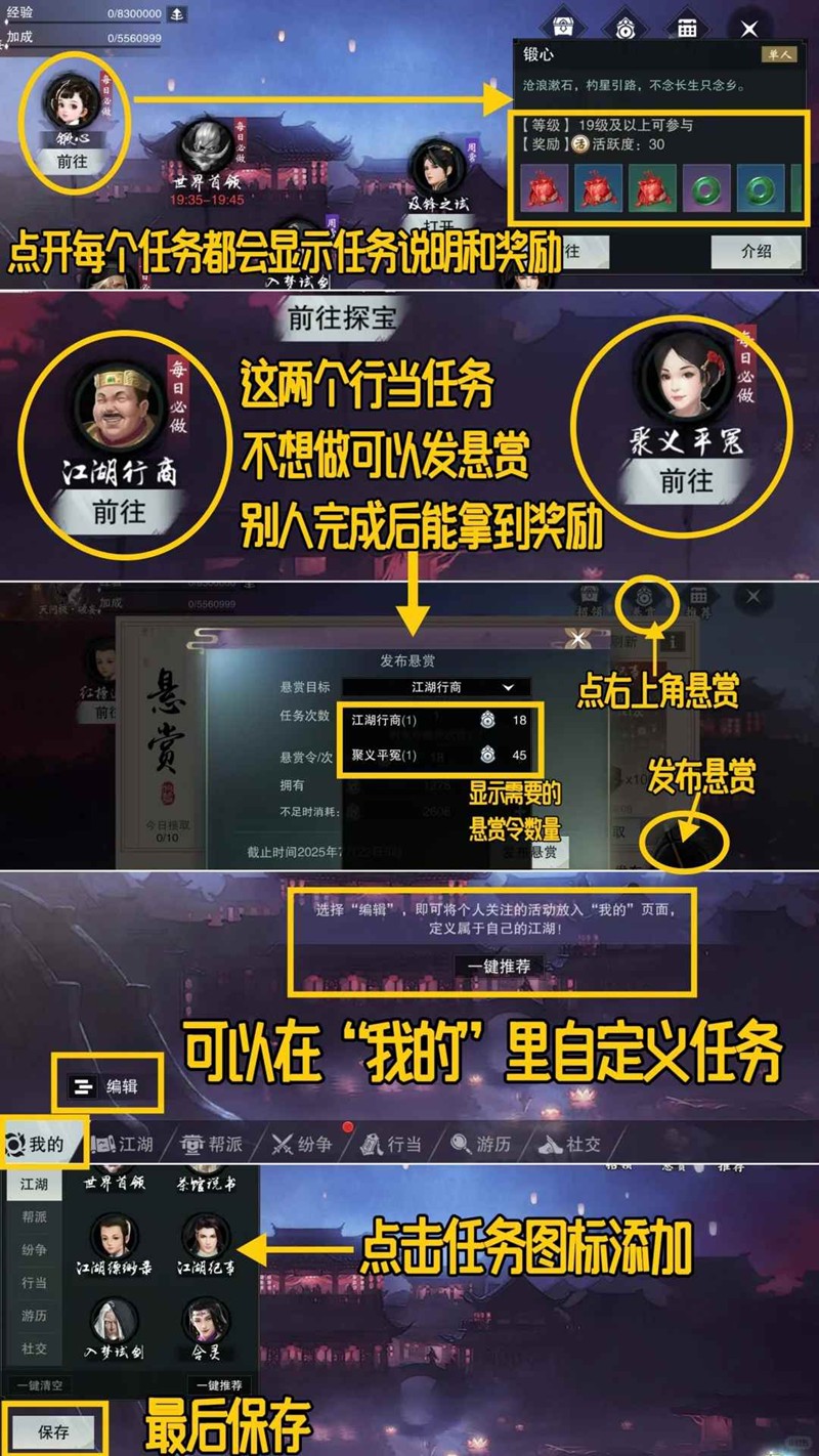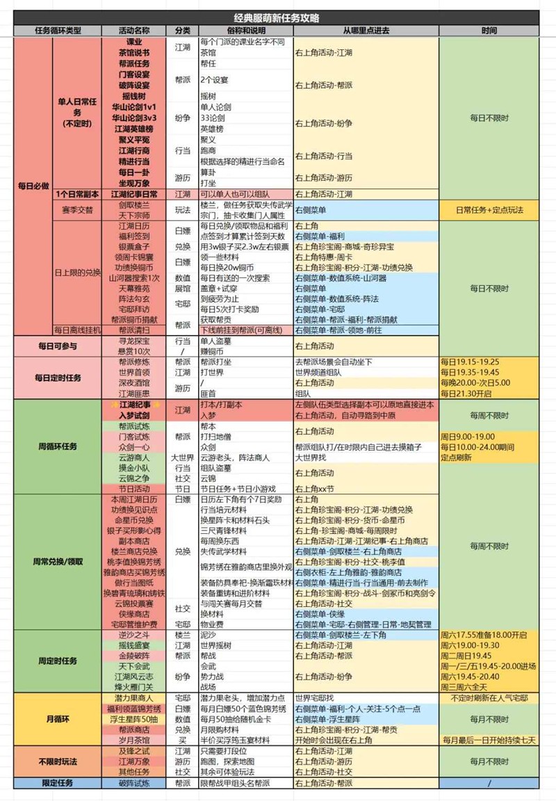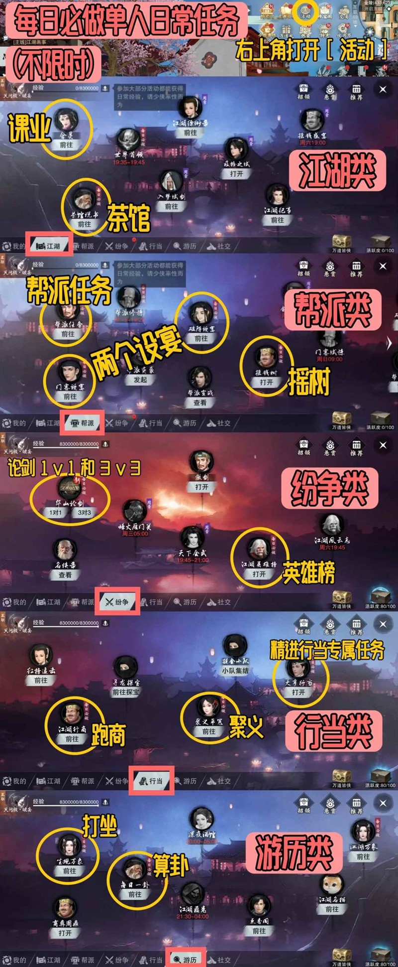 ①单人日常任务(不定时):★课业(每个门派名字不同),茶馆说书, 帮派任务,门客设宴,破阵设宴,摇钱树,华山论剑1v1和3v3,江湖英雄榜,聚义平冤和江湖行商(可悬赏),xx行当(根据选择的精进行当不同),每日一卦,坐观万象