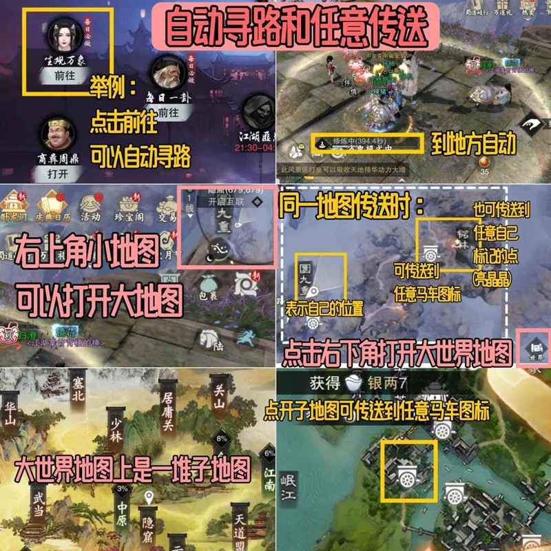 自动寻路和传送:这个游戏几乎所有玩法都可以自动寻路,接取后会自动跑来跑去。点击右上角小地图打开大世界地图,可以选择任意子地图,自动传送到任意马车图标,同一地图内可以点哪传送到哪