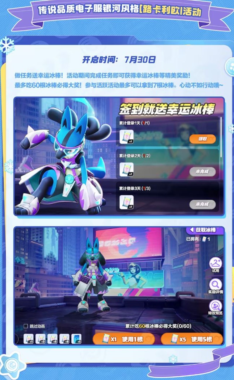 签到就送幸运冰棒:累计登录1天、2天、3天分别可获得不同奖励,累计吃60根冰棒必得大奖。