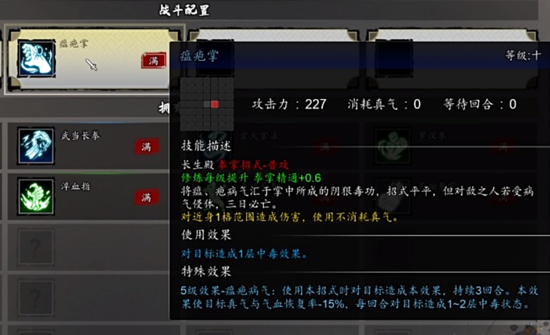 随着游戏进程推进,玩家需要更换更强力的拳法组合。推荐使用绵掌配合瘟庖掌的组合,这套搭配不仅能造成可观伤害,还能有效抑制敌人的恢复能力。武当派的太极拳也是中期不错的选择,这套拳法攻守兼备,招式行云流水。