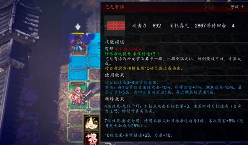 游戏后期推荐使用抗龙游回这套拳法,配合其他武学可以形成强力的连招体系。这套拳法兼具输出和控制能力,在PVE和PVP中都有出色表现。同时建议搭配四象无极功来提升伤害,在群战时可以使用云相太极心法,需要范围输出时则推荐吸星大法。