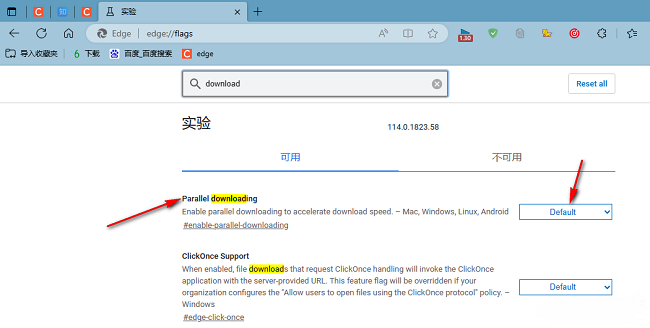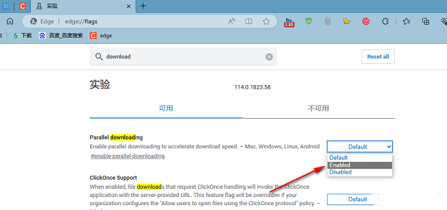 3、然后找到下方搜索结果中的"Parallel downloading",并点击其右侧的"Default"选项框的下拉按钮。