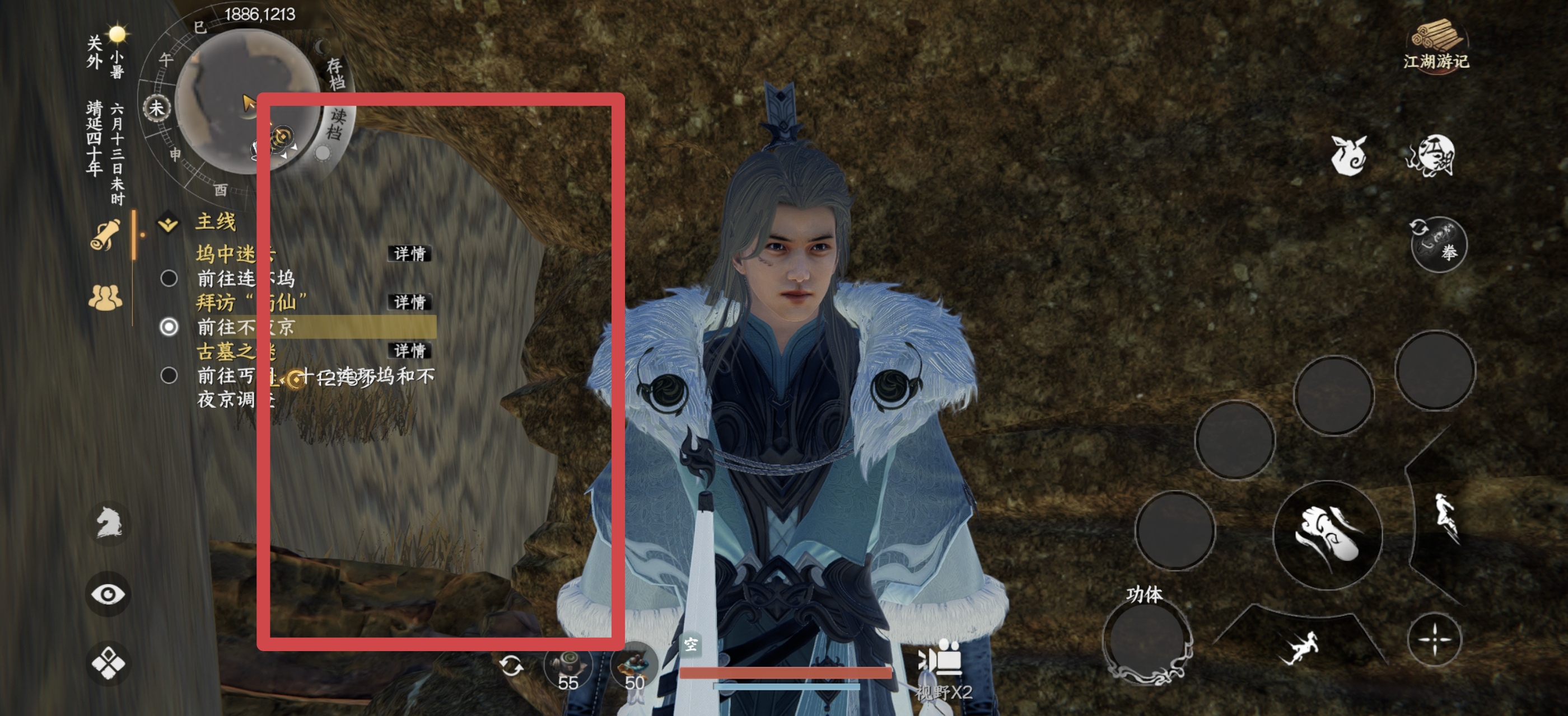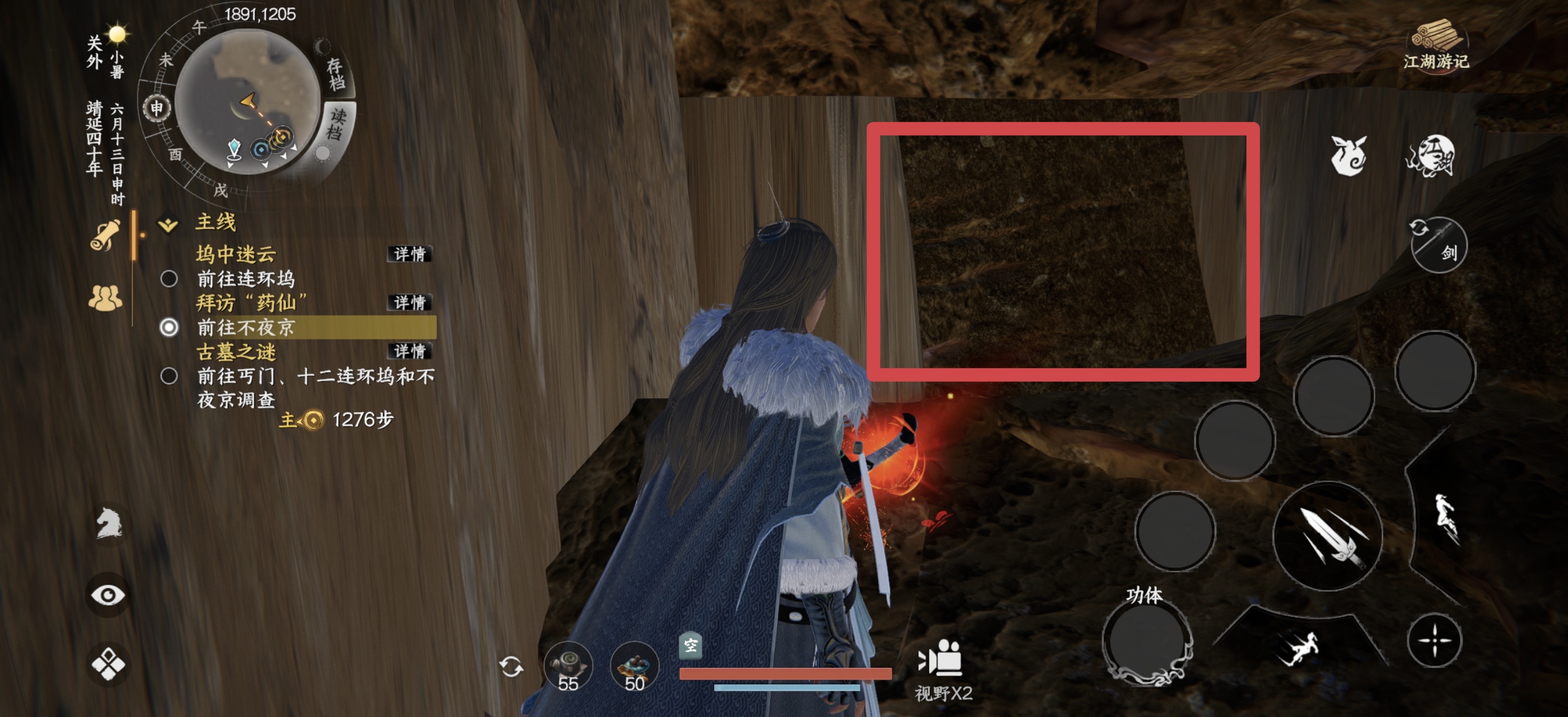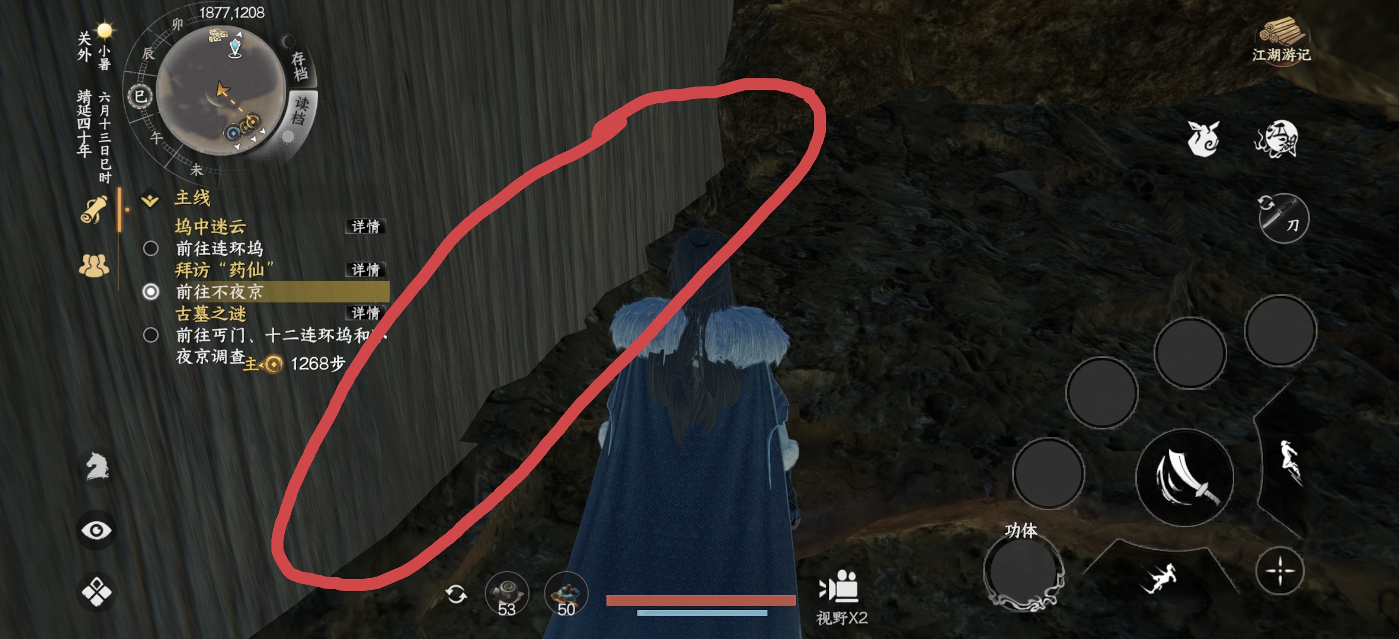 第一步,在1573,1041处行脚商人购买避瘴丹,然后到1890,1200左右有几块大石头,走上去会掉到山洞里。