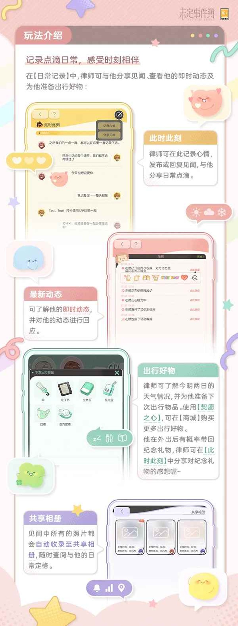 律师通过每日打卡及完成每日任务即可获取指定男主的【契愿之心】及【共感点】。同时,完成事项达成指定次数,点亮【趣享徽章】,也可获得【契愿之心】及【共感点】奖励。【共感点】可提升共感等级,并获得对应等级的共感奖励,奖励包含名片、未名晶片及思绪养成材料等。提升共感等级,还可解锁APP的【习惯打卡】及【备忘录】功能