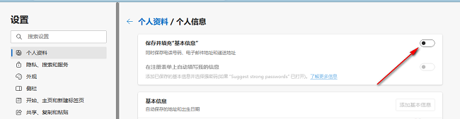 4、然后找到右侧中的"保存并填充基本信息"以及"在注册表单上自动填写我的信息",最后将其开关按钮关闭即可。