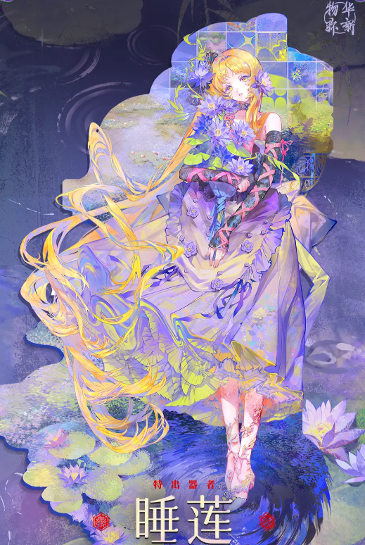 睡莲的职业为构术,带有远程控制治疗和减益的功能,她的常击“逐光”会对选定的单个敌人造成一定构素伤害,他的职业技“浮莲飘曳”会对选定的单体敌人造成百分比攻击力的构素伤,她的绝技“幻花水夜”会让自己得到瑞莲状态,并立刻得到再行动1次。