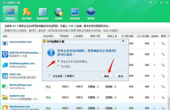 4、最后在弹出的提示窗口中,勾选"安全卫士本次运行时禁止"或者"永久禁止",随后点击"确定"即可。