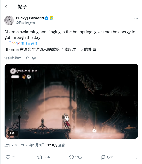 不少粉丝表达了对谢尔玛的喜爱,其中包括《幻兽帕鲁》的开发者Bucky,他表示:“谢尔玛在温泉中游泳和唱歌的样子,让我每天都充满能量。”