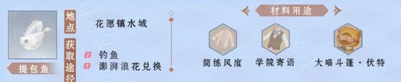 花愿镇水域是提包鱼的出没地点。这种鱼外形独特,获取时需要准备简练的风度、学院的寄语以及大喵斗篷伏特等道具。和纱裙鱼一样,提包鱼也可以通过澎湃浪花兑换获得。玩家在钓这种鱼时需要注意水域的选择。
