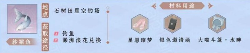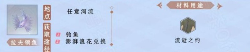 拉夫领鱼可以在任意河流中钓到。获取这种鱼需要消耗流逝之约道具,同样支持使用澎湃浪花兑换。拉夫领鱼的特点是游动速度快,需要玩家掌握好钓鱼时机。微风绿野水域则是绸带鱼的栖息地,这种鱼也可以通过澎湃浪花兑换获得。