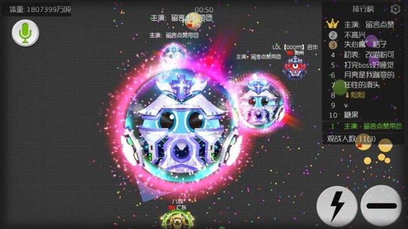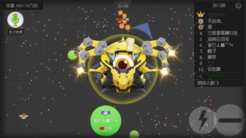 分身后需要学会吐球操作。点击闪电键可以将体重转化为孢子吐出来,让另一个分身吃掉这些孢子来增大体积。通过吐球可以让其中一个分身保持较大体积,另一个作为侦察兵探路。这种操作既能避免被对手吞噬,又能保持进攻能力。