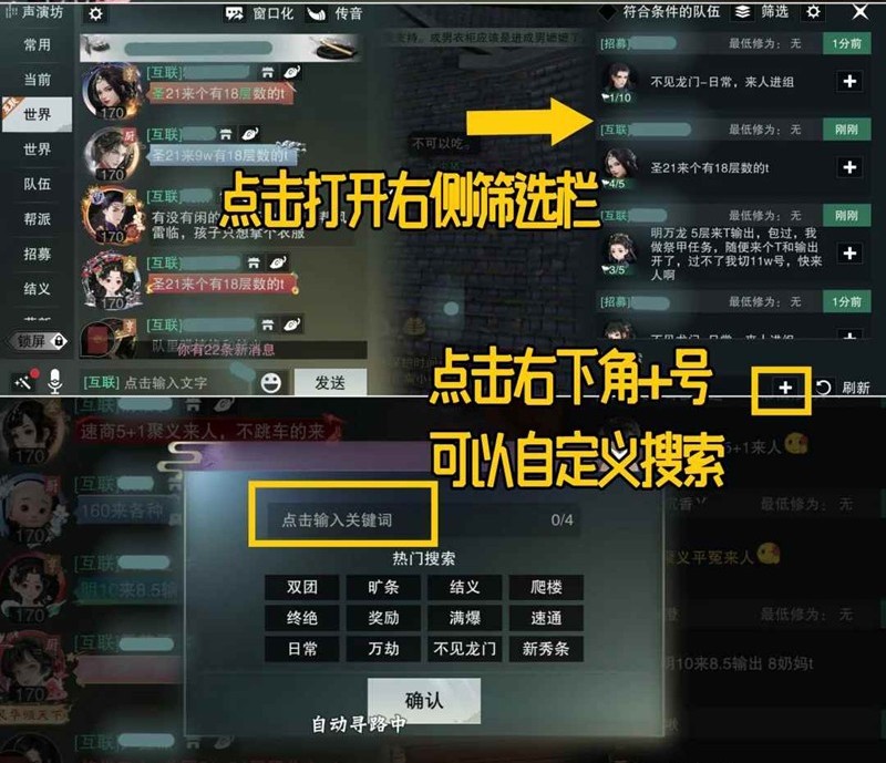时间:2025-09-12 | 作者: | 阅读:0世界频道有很多“xxx来人”的黑话,新出了黑话搜索功能如图1。点击绿色字样可查看同类型喊话,或在左侧队伍栏点击便捷组队,点击玩家头像可申请入队