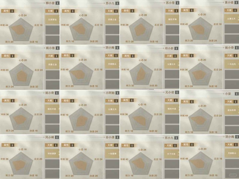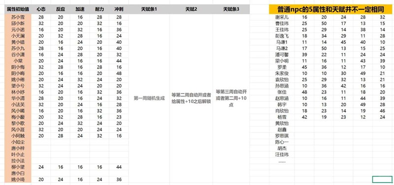 - 目前第一周每个小孩5个属性之和都是120,每个属性有所不同(50封顶),各有所长。每人每次比赛给5点加点(周上限30),随机获得别人的一条天赋。每个人属性加10点能解锁第二个天赋格子,选择随机替换第二或第三条天赋