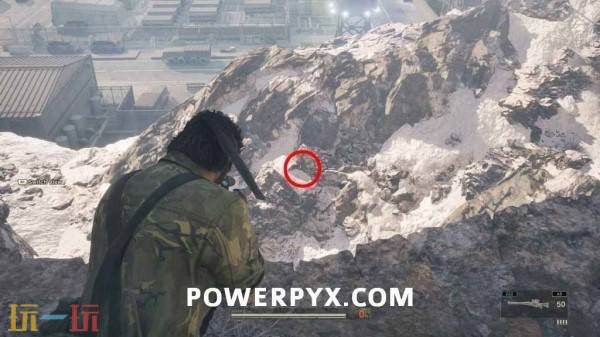 位于下方一些小岩石堆中。在标有数字07的塔旁边有两个红白锥桶,瞄准锥桶之间的缝隙慢慢往下挪准星,几秒之后可以在岩石堆中看到这只鸭子,非常难看到,需要从斯内克所在的悬崖边缘大约倾斜50-60°角才能看到。