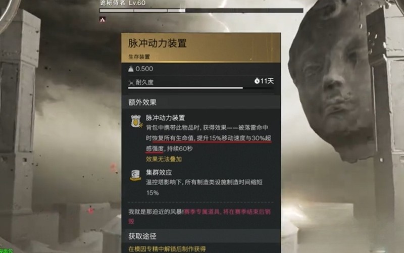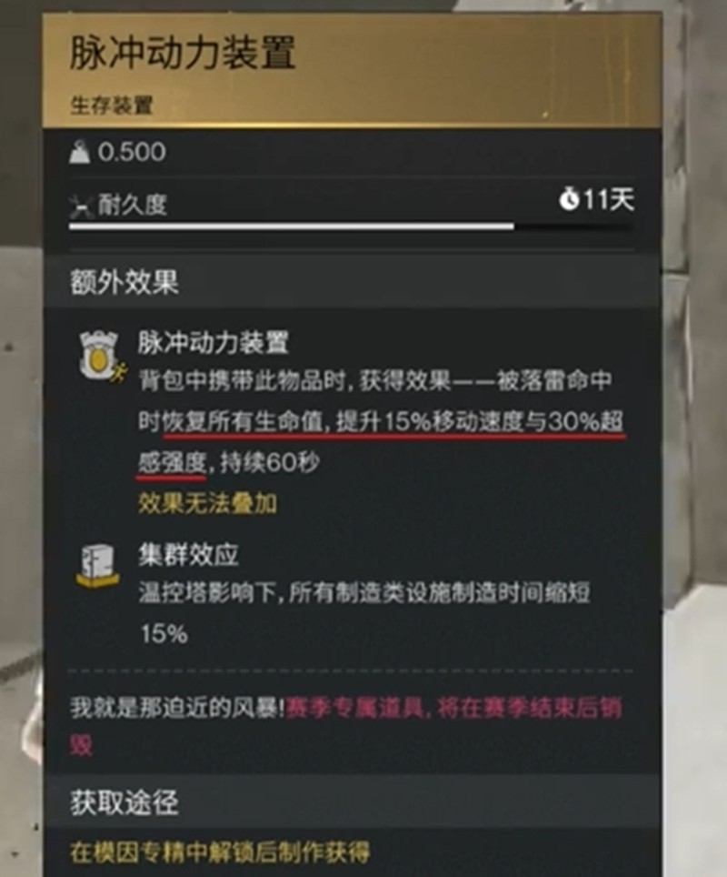 除了保命功能外,脉冲动力装置还能提供15%的移动速度加成。这个增益效果在被落雷击中后立即生效,持续60秒。无论是追击敌人还是紧急撤离,速度提升都能带来明显的战术优势。