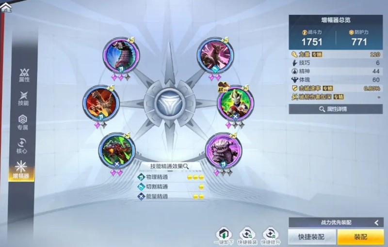 技能升级需要消耗不同品质的技能芯片。每个奥特曼都有独特的专精方向,分为力量、技巧、精神和体魄四种类型。迪迦就是典型的力量专精型角色。通过奥特训练场获取战斗记录议,可以提升专属等级,进而增强技能效果。