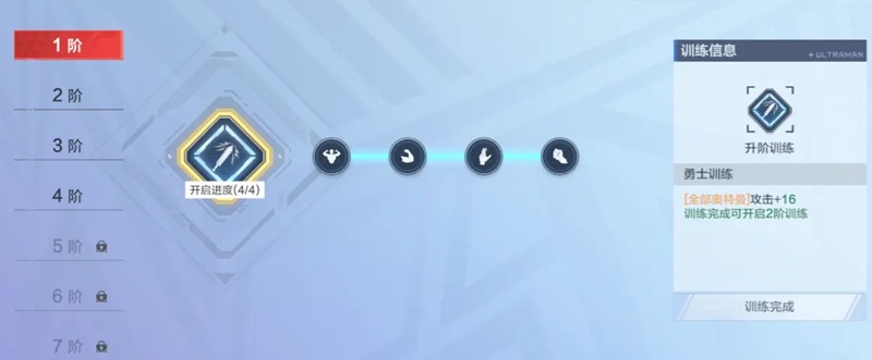 警备队的勇气训练是全队共享的养成系统。通过消耗训练点进行加点,可以为所有奥特曼提供属性加成。潜能档案则会在达成特定条件时升级,比如解锁迪迦所有形态后,闪耀迪迦的潜能突破会提升全队属性。