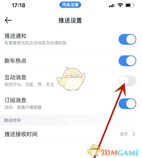 3、进入推送设置页面,点击关闭“互动消息”,这样,收到回复、评论等就不会推送消息了。