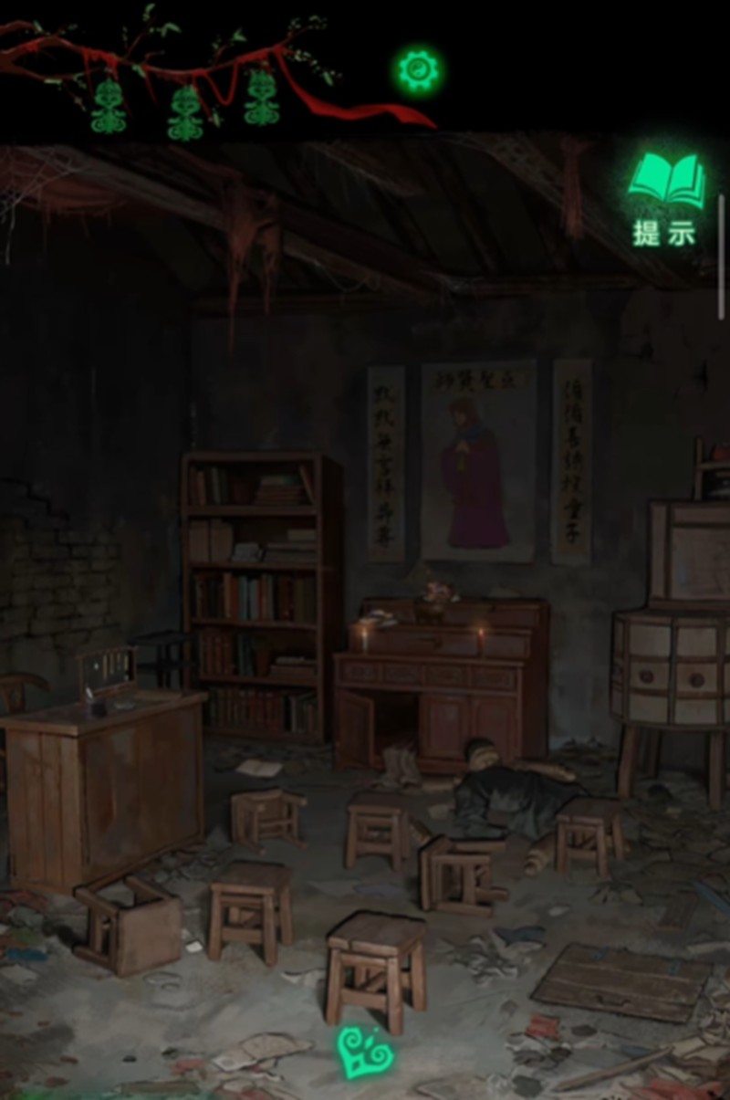 离开民居来到村口石碑处,将石片嵌入石碑后,根据笔画线索点击石块就能开启学堂的门。进入学堂后与木偶手互动,用玩具手枪换到直尺。使用直尺从另一个房间的墙缝中挑出红绳,回到学堂把红绳用在西洋镜上,查看西洋镜可以获得关键线索。