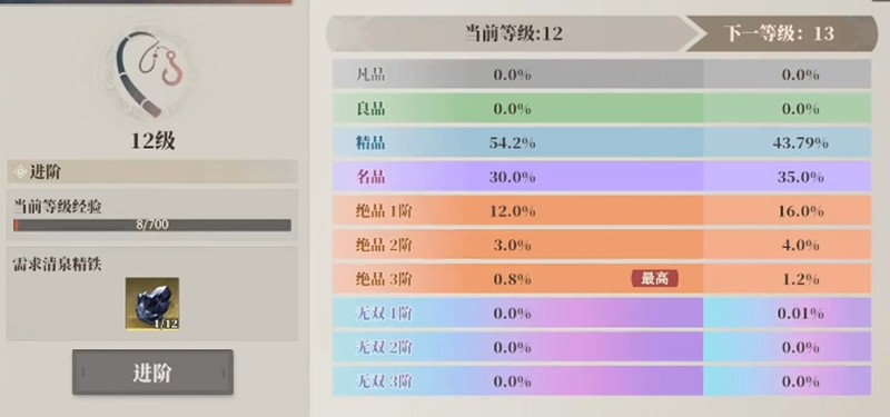 装备品质从凡品到无双三阶不等,品质高低与渔弋等级直接相关。提升渔弋等级需要积累钓鱼次数,并使用清泉精铁进行进阶。清泉精铁可以通过试炼兵械库获得。渔弋等级越高,获得高品质装备的概率就越大。