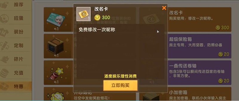 如果免费改名次数用完了,还可以使用迷你币购买改名卡。在游戏商城的特惠栏目中,花费300迷你币就能获得改名卡道具。有了改名卡后,就能再次修改自己的游戏昵称了。