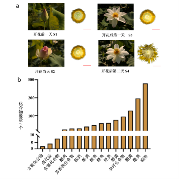 荷花S1-S4时期图及雄蕊挥发物检测结果。a.不同花期荷花雄蕊的表型;b.荷花开花期雄蕊挥发性有机物检测统计。统计发现,荷花香气释放量随生长阶段剧烈变化:开花当天(S2)和开花后第一天(S3)是香气最浓郁的时期,雄蕊中的“香气分子”会大量释放,例如大根香叶烯 D 和紫罗兰酮,这种物质的“香气影响力”十分显著,能让荷花的香味在空气中扩散得更远。
