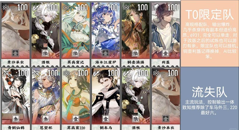 高规格配队,输出爆炸,几乎杀穿所有副本但造价高昂。6931(六致知酒帐3致知素纱单衣),完全可以单走,对于改版之后的试炼也可以游刃有余。限定队也可以挂机。铜壶利簋记得换掉,AI比较笨。