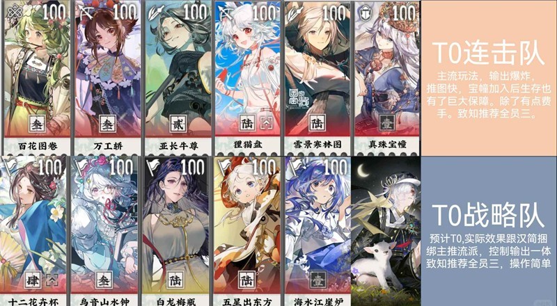 主流玩法,输出爆炸,推图快,宝幢加入后生存也有了巨大保障。除了有点费手。致知推荐全员三。很多图可以一回合速通。期待越王焕彰可以和连击碰碰。
