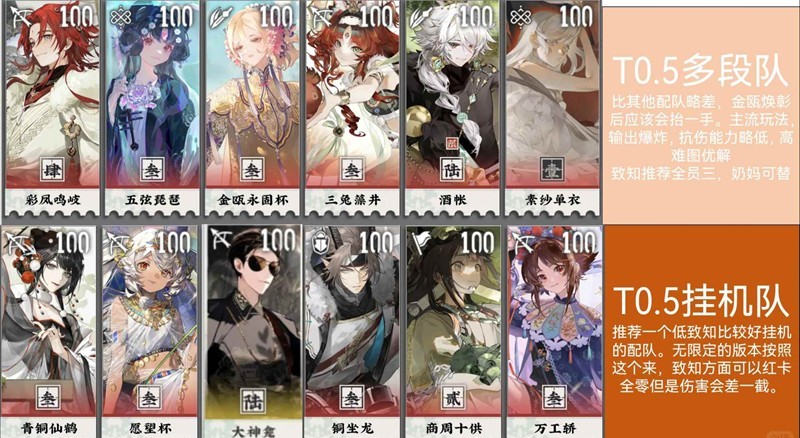 比其他配队略差,金瓯焕彰后应该会抬一手。主流玩法,输出爆炸,抗伤能力略低,高