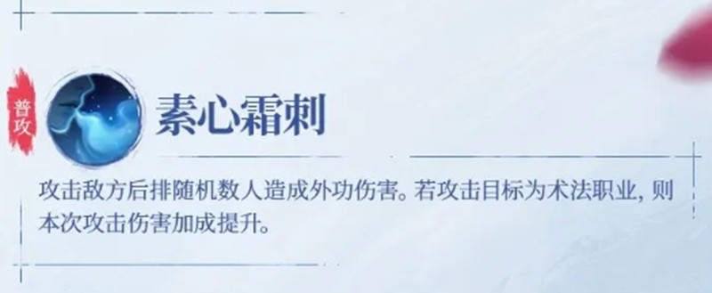 素心霜剌作为普攻技能,能对敌方后排随机数人造成外功伤害。这个技能让她能有效针对后排输出单位,特别是对术法职业有明显的克制作用。