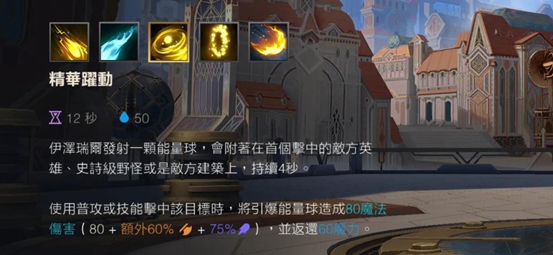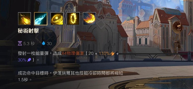 一技能秘术射击是伊泽瑞尔的核心输出技能,命中后可以减少其他技能的冷却时间。后期配合装备的冷却缩减,可以做到几乎无间断地释放技能。二技能精华跃动不仅能造成伤害,还能通过后续普攻或技能命中回复法力值,解决了前期蓝耗问题。
