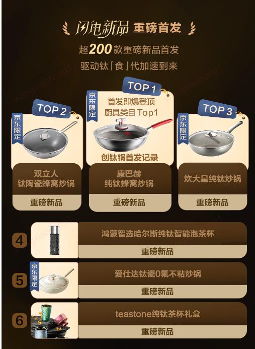 新品首发也成为本次活动的一大亮点。活动期间,超200款钛厨具重磅新品在京东首发,低至3折,极大激发了消费者选购热情。其中,康巴赫纯钛蜂窝炒锅,首发4小时销售额即破百万,成功登顶厨具类目TOP1,创下京东钛锅品类首发销售新纪录。该产品是京东与康巴赫聚焦纯钛蜂窝赛道深度共创的“红运系列”限定新品,搭载康巴赫蚀刻蜂窝纹理技术,以精密微凸结构形成物理屏障,实现少油烟、不易粘。作为京东独家包销款,其日销定价699,京东首发限时仅499元,一开售就受到消费者的高度青睐。此外,双立人钛陶瓷蜂窝炒锅、炊大皇纯钛炒锅、爱仕达钛瓷0氟不粘炒锅等京东“红运系列”限定新品,以及鸿蒙智选哈尔斯纯钛智能泡茶杯、teastone纯钛茶杯礼盒,同样凭借优质性能和创新设计实现单品突围,成为追求品质的消费者的热门之选。