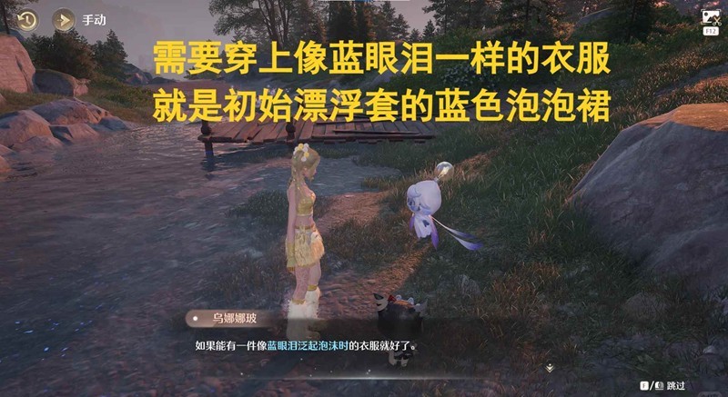 我们得知需要一套像蓝眼泪泛起泡沫时的衣服,就是初始漂浮套的蓝色泡泡裙;