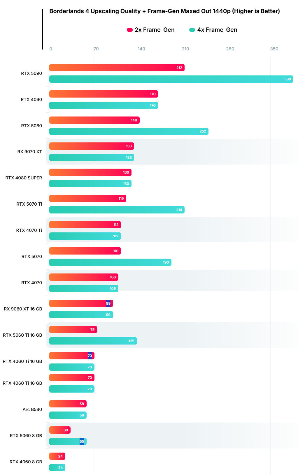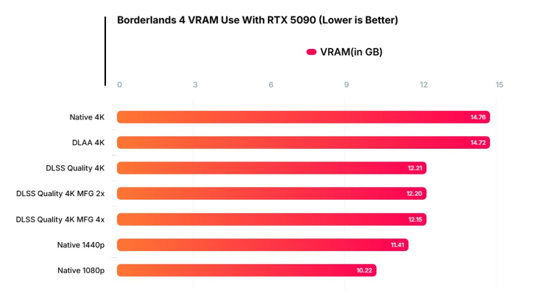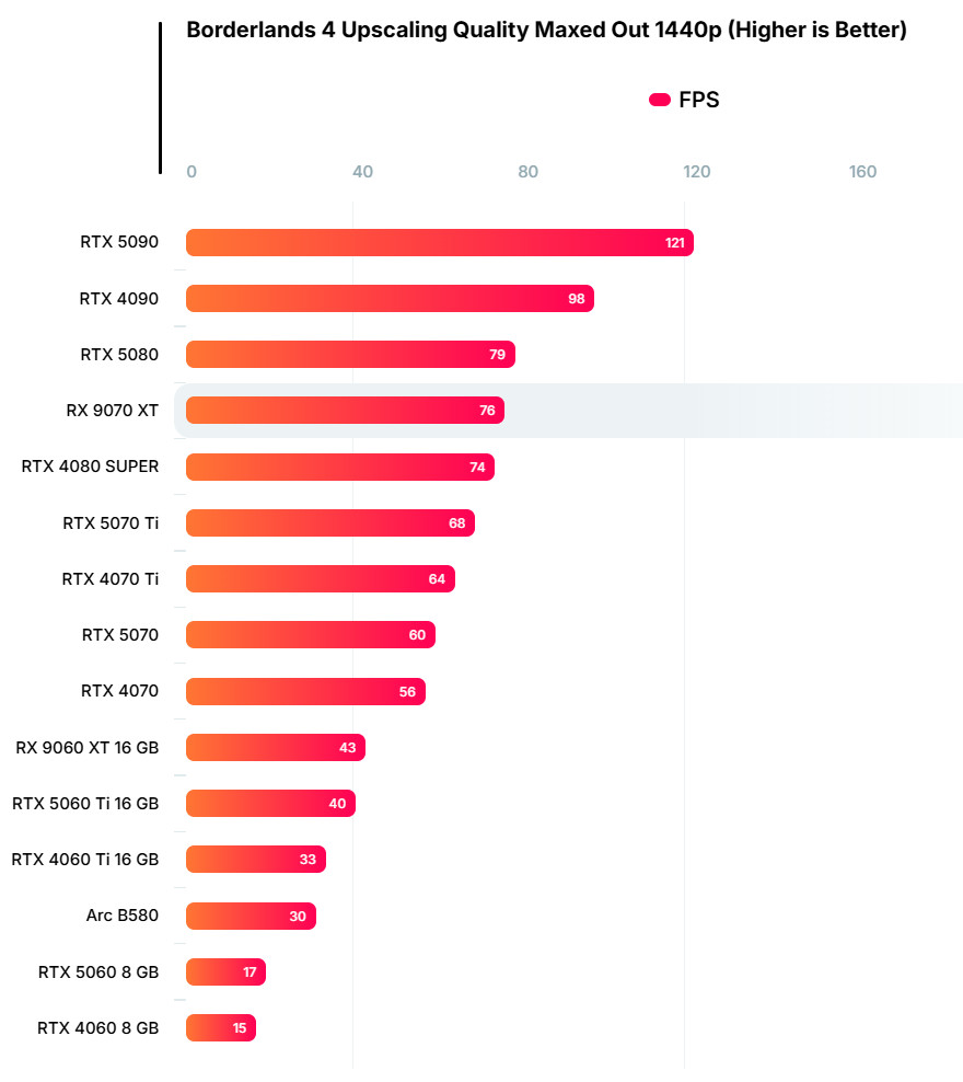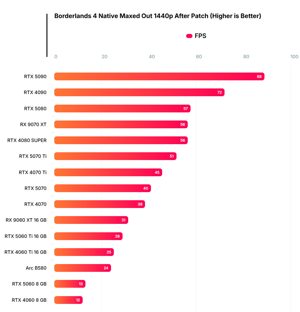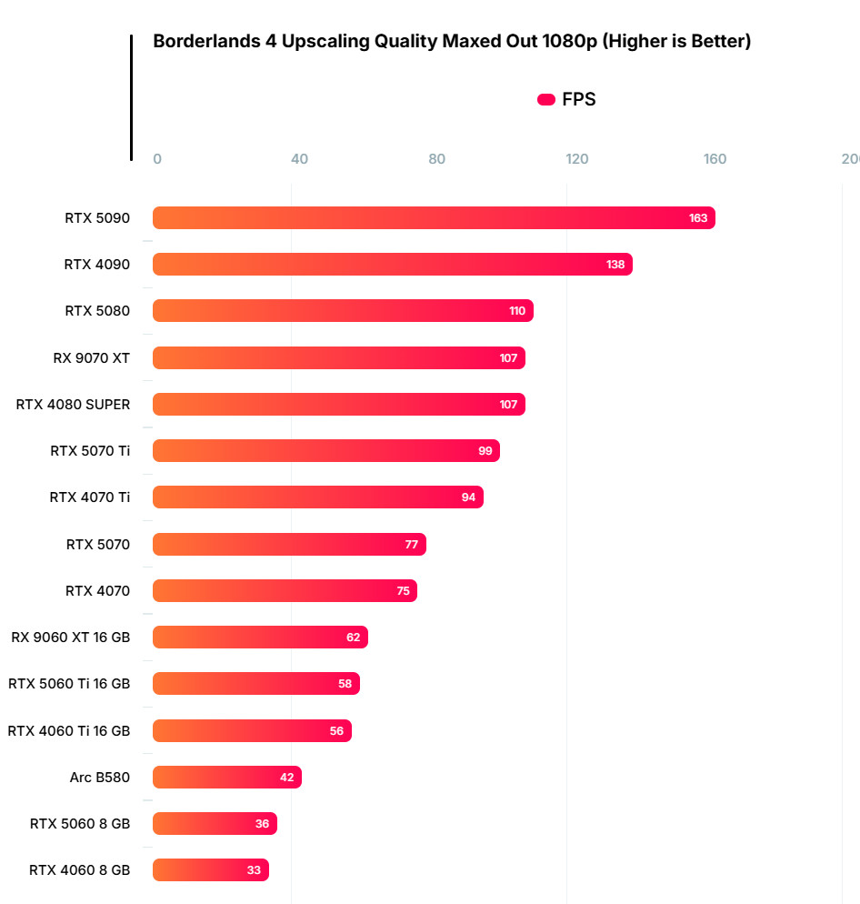 时间:2025-09-15 | 作者: | 阅读:0外媒WCCF测试了《无主之地4》的优化情况,涵盖RTX 50和40系所有主流及以上显卡。然而很遗憾的是,当前没有一款显卡能在原生4K最高画质下达到60FPS。RTX 5090,平均仅为48 FPS,而其他显卡的帧数在8-40之间。
